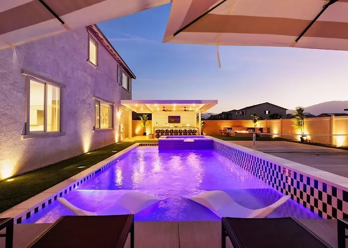Die 4-Zimmer- 7Br Pickleball Firepit Outdoor Kitchen Game Room befindet sich 4 km weit weg von Fantasy Springs Resort Casino entfernt und bietet einen einen Jacuzzi und einen Whirlpool. Zur Entspannung der Gäste bietet diese Villa eine sonnige Terrasse mit einem Esstisch.